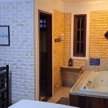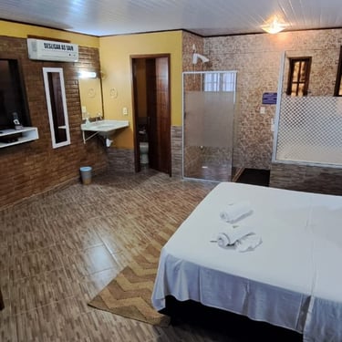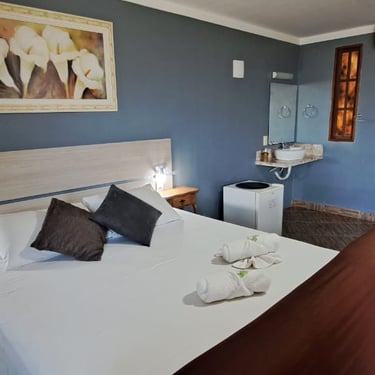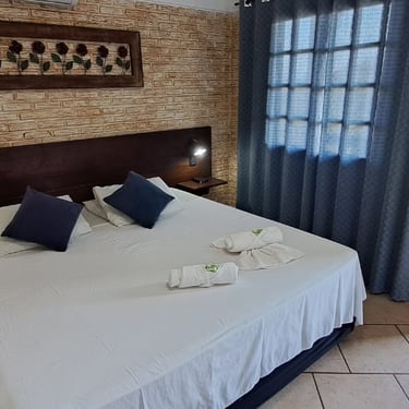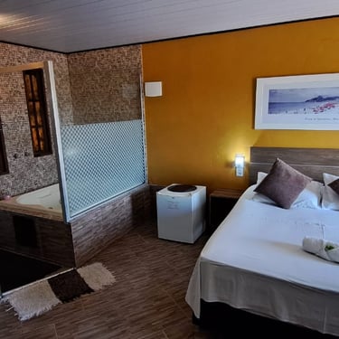 (acomoda apenas casal) Com 30mts2, isolamento térmico e acústico, varanda privativa com vista, 01 cama QUEEN SIZE, ar condicionado SPLIT 12 mil btus com controle remoto, tv de LED 32, tv a cabo, frigobar, WC com box blindex, banheira de hidromassagem dupla.