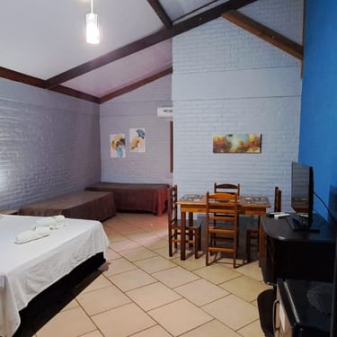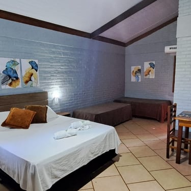 (acomoda até 05 pessoas) Com 30mts2, isolamento térmico e acústico, varanda privativa com vista, 01 cama QUEEN SIZE, 02 camas de solteiro, 01 bicama, ar condicionado SPLIT 12 mil btus com controle remoto, tv de LED 32, tv a cabo, frigobar, WC com box blindex.