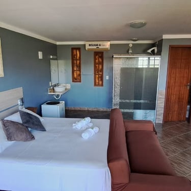 (acomoda apenas casal) Com 30mts2, isolamento térmico e acústico, varanda privativa com vista, 01 cama QUEEN SIZE, ar condicionado SPLIT 12 mil btus com controle remoto, tv de LED 32, tv a cabo, frigobar, box blindex agregado ao quarto com chuveiro duplo, WC, sofá.